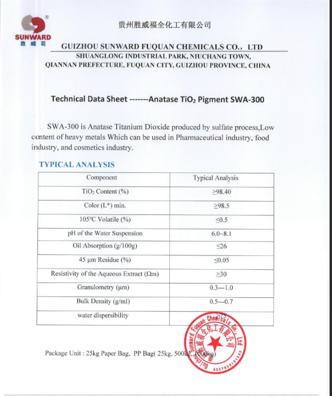 SWA-300 is a high-quality ANATASE TiO₂ pigment produced by Sunward Group using the sulfate process. It features excellent whiteness, strong opacity, and cost-effective performance—ideal for Medicine/food and cosmetic industries, CHEM FIBER and paper applications.